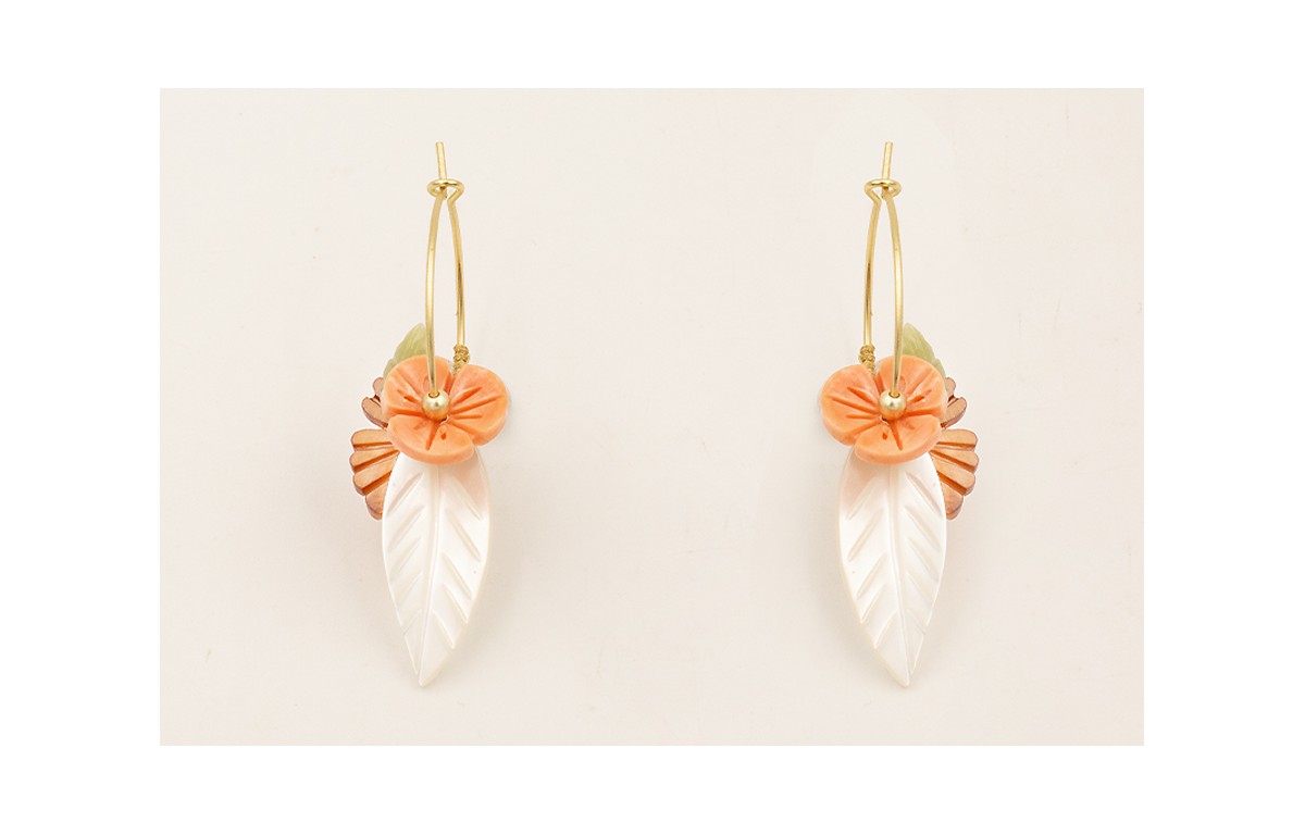 Pendientes aro mediano dorado mate con hoja y flor de resina coral, abanico nacar, medio nudo macramé hilo dorado.
