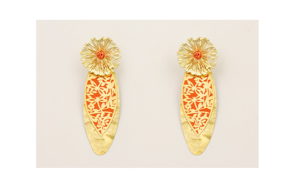 Pendientes flor grande con flor de resina coral, colgante lentejuela ovalada oro y plata con colgante ovalado con dibujos naranjas en latón.