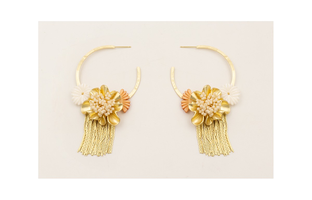 Pendientes aro labrado con colgante fleco, flor nacar blanco, abanico nacar, ramillete abalorio beige, flor con borde de aristas dorada mate.