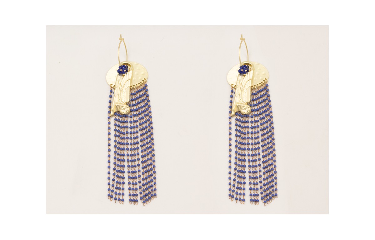 Pendientes chapa curvada martilleada dorada mate con fleco de cadena de miyuki azulón, pieza egipcia, burruño abalorio azulón.