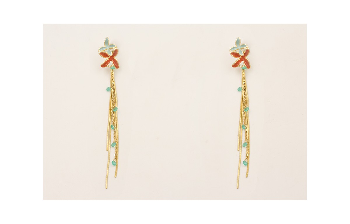 Pendientes perno doble flor esmaltada turquesa y teja con fleco dorado mate y cadena crsitales turquesas.