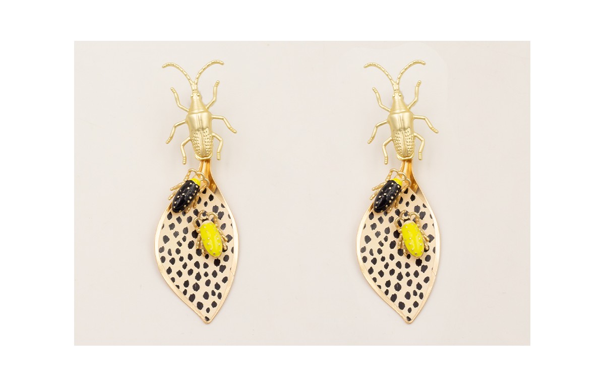 Pendientes perno insecto dorado mate, hoja piel tigre con escarabajos esmaltados lima y negro.