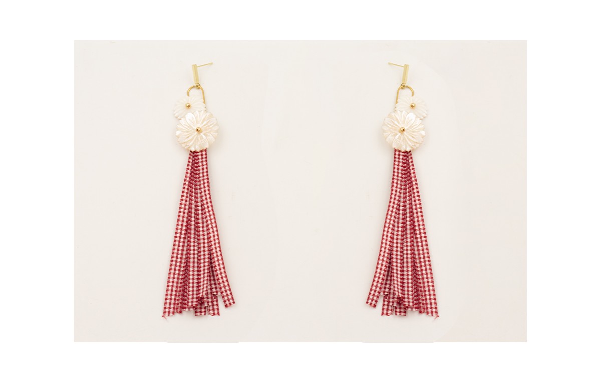 Pendientes ACERO INOXIDABLE listón, eslabón rectangular, flores redondes nacar y fleco lazo vichy cuadros burdeos.