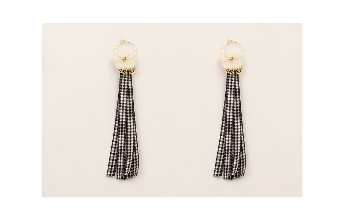 Pendientes ACERO INOXIDABLE aro pequeño floco lazo vichy cuadros negros, flor redonda nacar y colgante gingko.