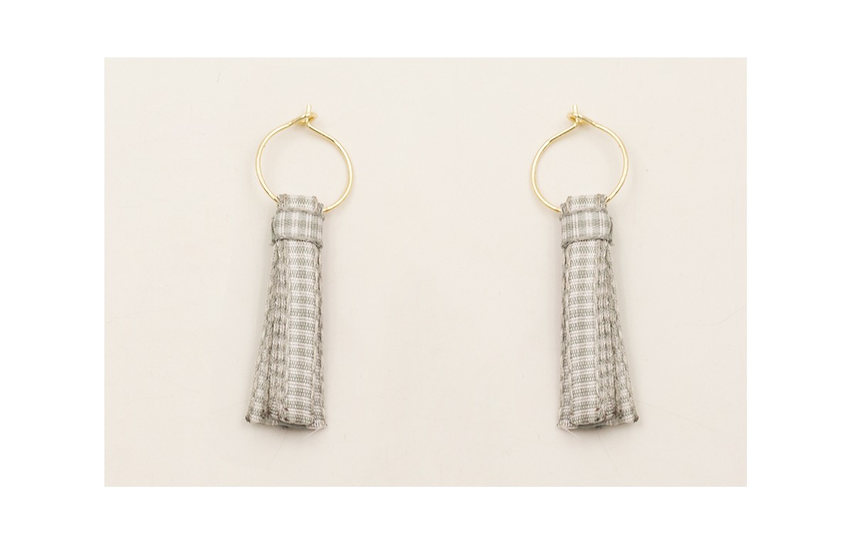Pendientes ACERO INOXIDABLE aro pequeño con fleco lazo vichy cuadros grises.