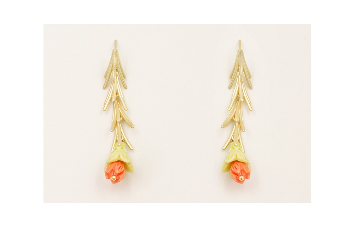 Pendientes colgante ramilletes dorado mate con campanillas resina coral en verde y color coral.