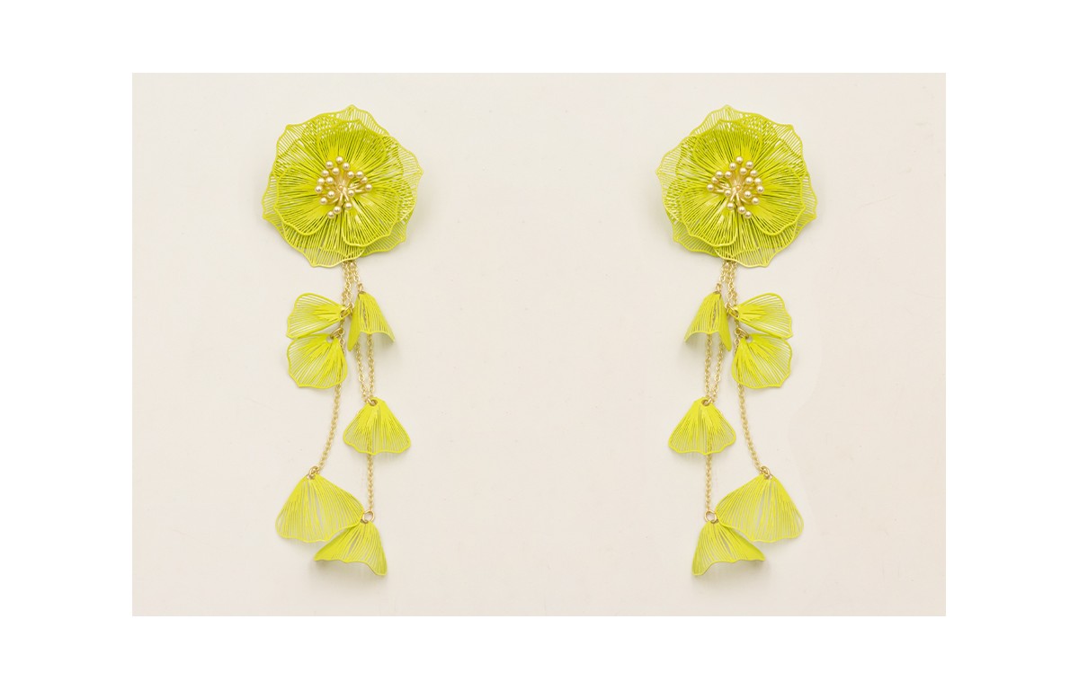 Pendientes flores 2 capas esmaltadas en color lima con cascada de petalos en el mismo color.