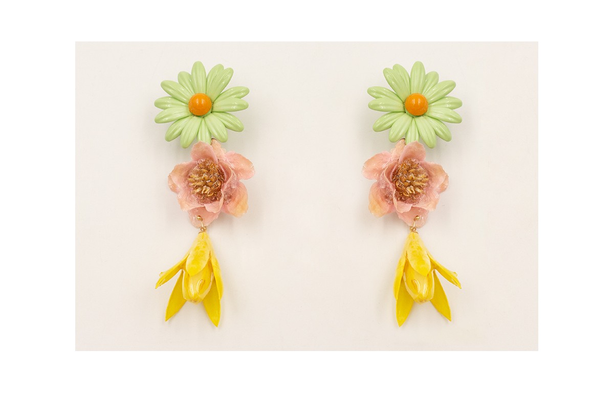 Pendientes flor grande esmaltada verde con campanilla abierta resina amarilla y flor natural resina rosa.