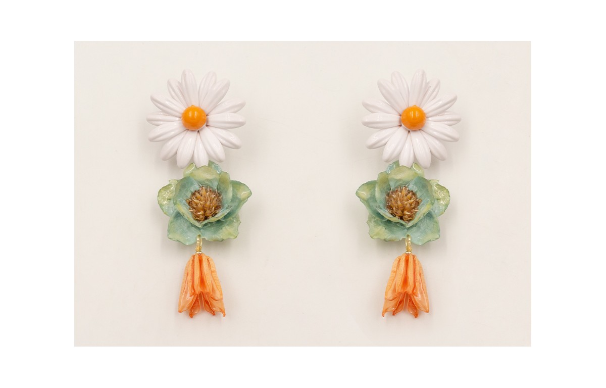 Pendientes perno flor grande esmaltada blanca centro color huevo, flor azul y colgante campanilla naranja.