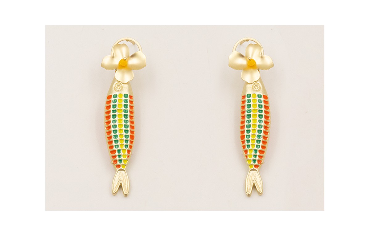 Pendientes aro con flor plana y facetada amarilla con colgante pez esmaltado en colores.