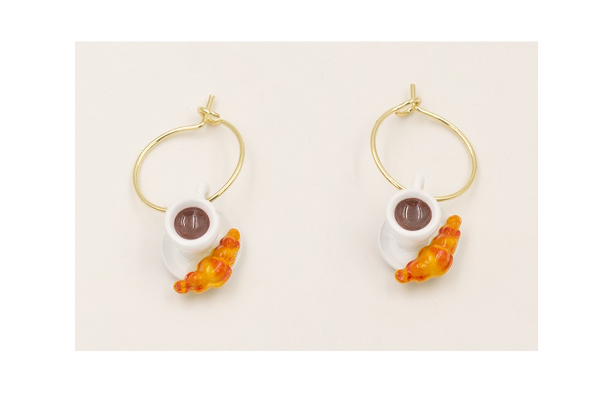 Pendientes aro ACERO INOXIDABLE con colgante taza y croissant esmaltados.