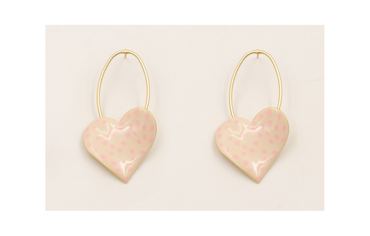 Pendientes herradura grande con corazones esmaltados beige y motas rositas