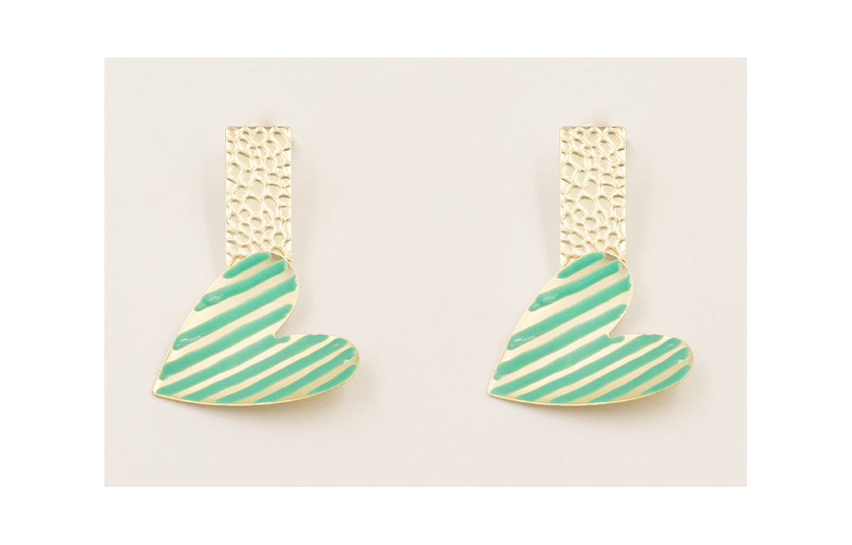 Pendientes perno rectangular relieve reptil y colgante corazón lineas turquesas.