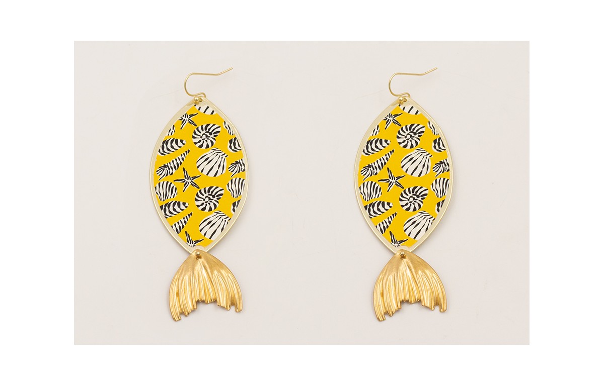 Pendientes pieza ovalada conchas con fonde amarillo, cola pez dorada y gancho sencillo.
