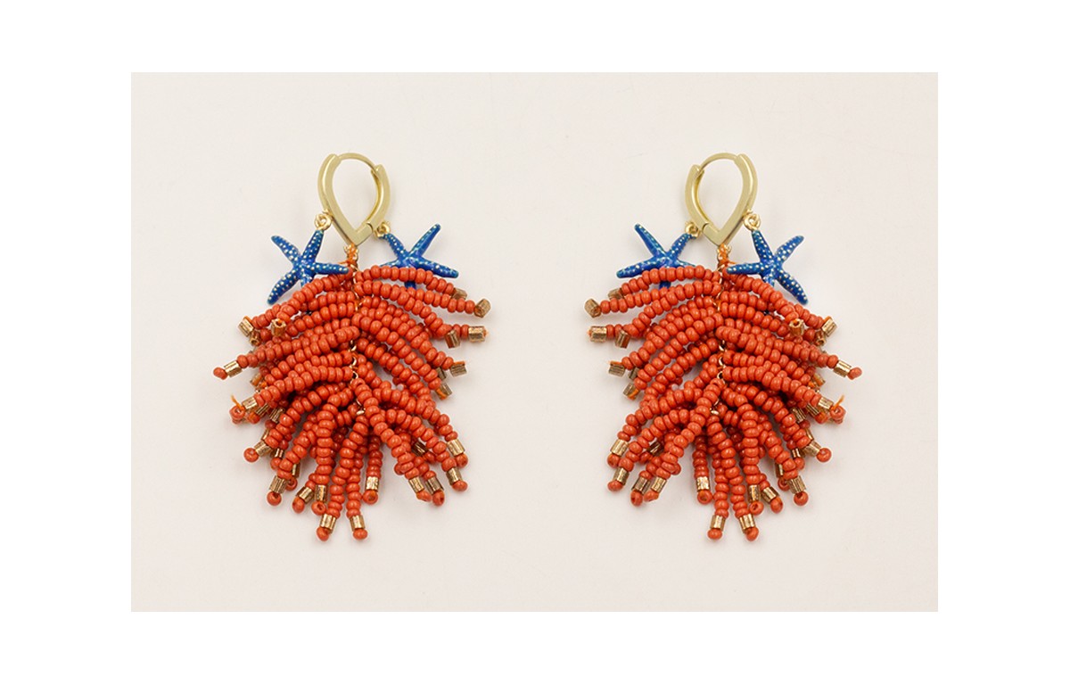 Pendientes floco abalorio naranja, estrellas esmal