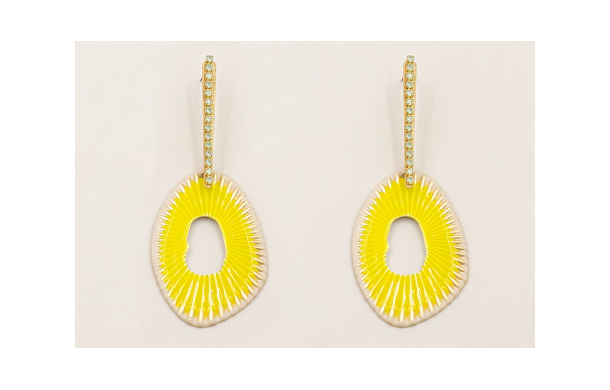 Pendientes ovalo estriado esmalte fluor con perno lamina satinada y cadena de strass agua opal.