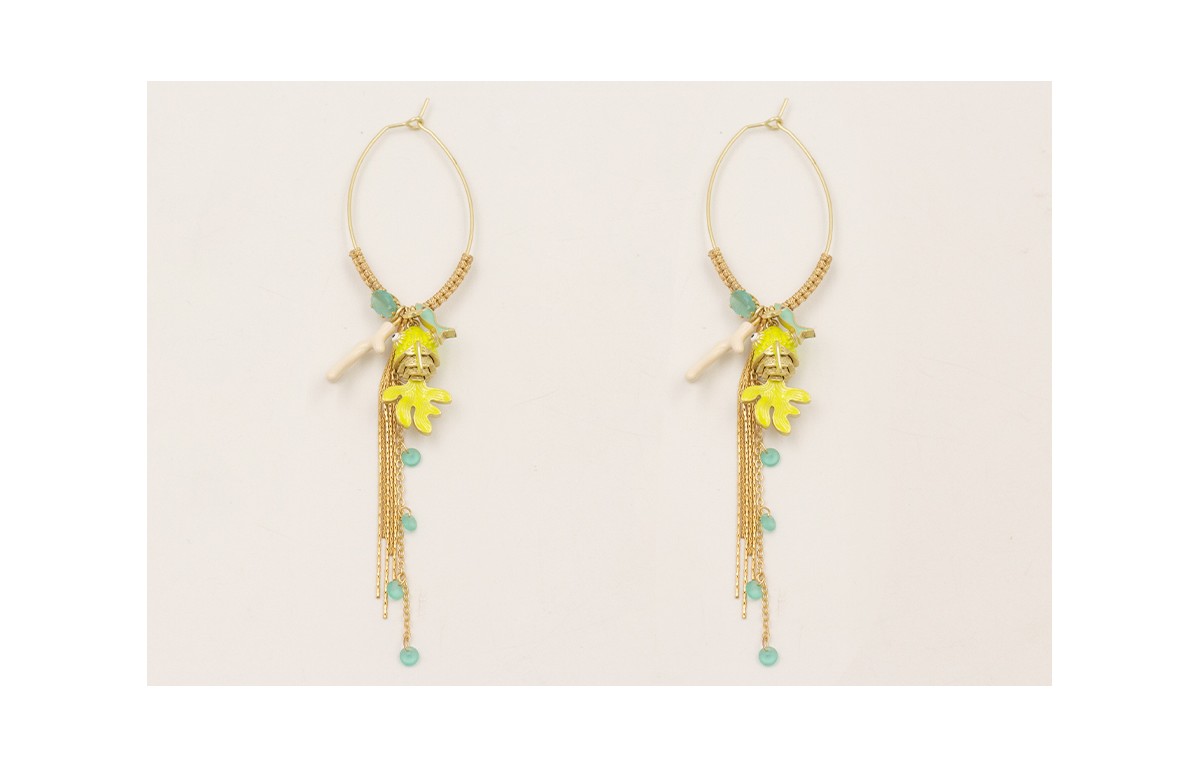 Pendientes aro ovalado con medio nudo macramé dorado, pez artuculado lima, pez esmalte truquesa, rama coral esmalte beige, cabujón aqua, flecos cadenas.