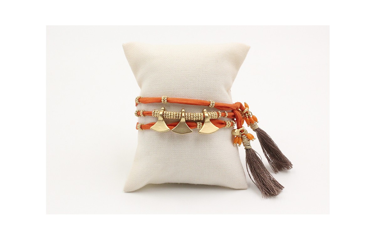 Pulsera de seda natural naranja con rueda estriada, colgante 3 triangulos y rematada con pompon color topo y coralitos colgando. Largo 56cm