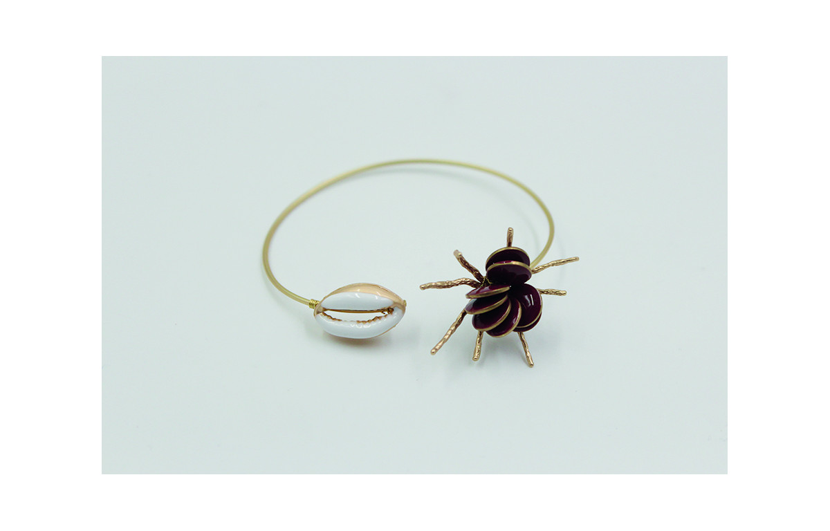 Pulsera rigida fina con esmaltes granates y concha esmaltada blanca.