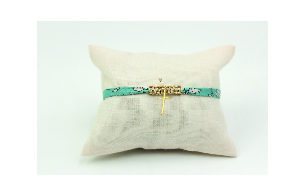 Pulsera lazo liberty azul con flores blancas, macrame oro palido y cruz y perla mini colgadas.