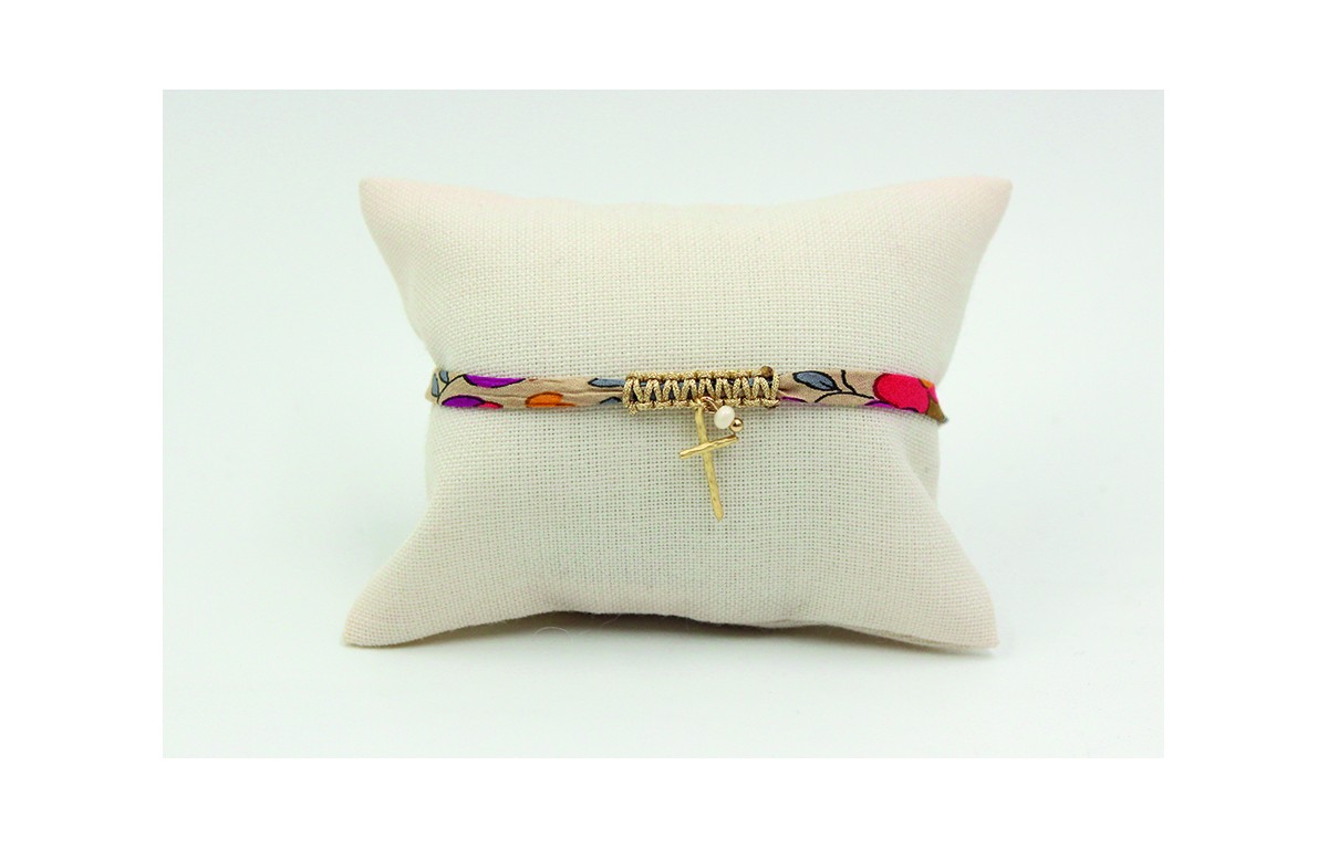 Pulsera lazo liberty crudo con flores rojas, moradas,azul y macrame oro palido y cruz y perla mini colgadas.