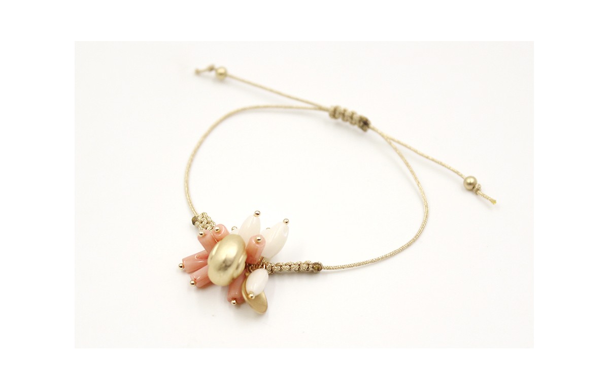 Pulsera hilo macrame dorado con semipreciosas rosas y blancas, conchas oro mate. Pulsera regulable