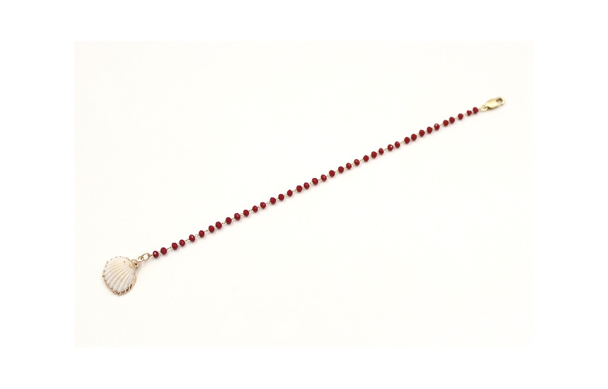 Pulsera cadena facetadas granates remateda con concha blanca y borde dorado. Largo 17cm.