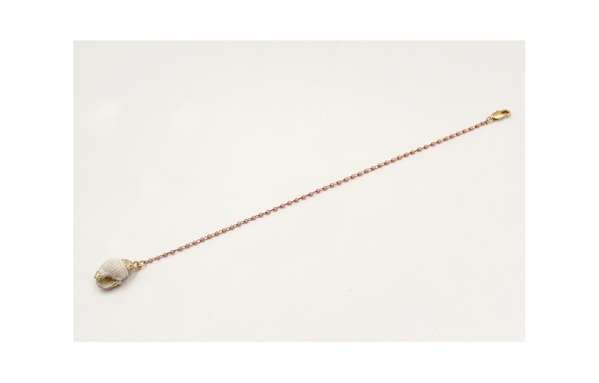 Pulsera cadena de miyuki rosa rematada con caracola blanca borde dorado. Largo 17cm
