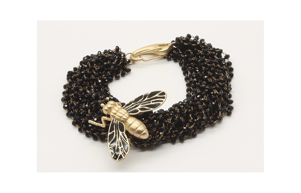 Pulsera varias vueltas cadena facetadas negras y mosca dorada y negra. Largo 18cm.