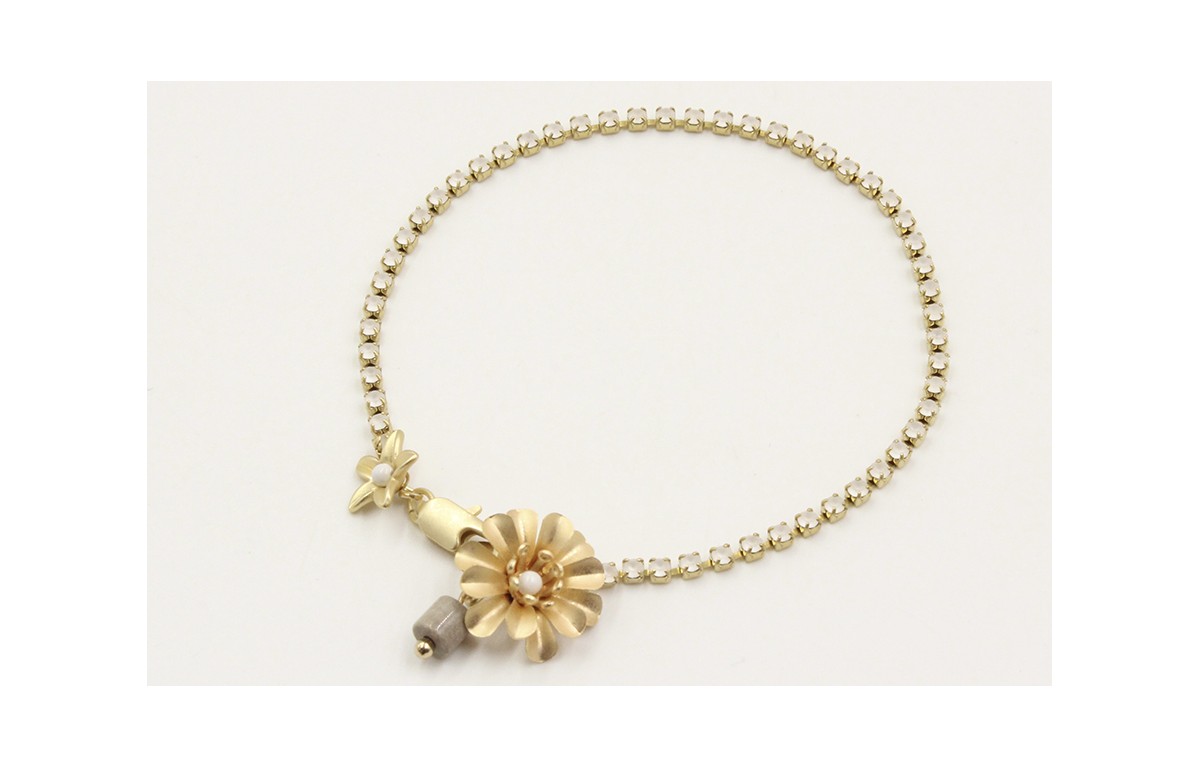 Pulsera cadena de strass color cristal opal con flor de estambres en oro mate y piedra color topo. Largo 17cm.