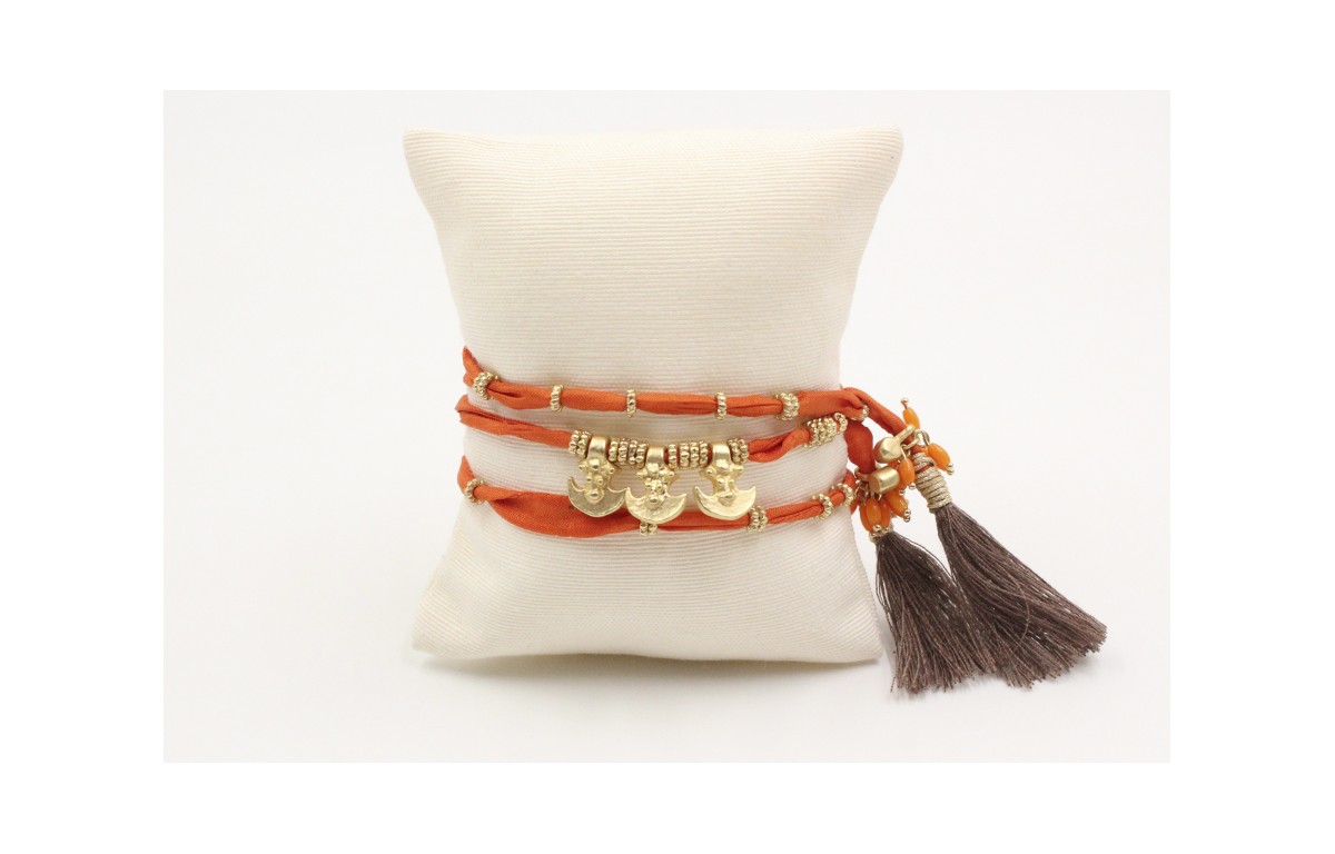 Pulsera de seda natural naranja con rueda estriada, colgante 3 medialunas y rematada con pompon color topo y coralitos colgando. Largo 56cm