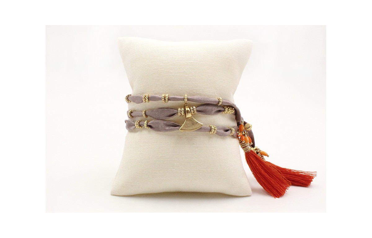 Pulsera de seda natural gris con rueda estriada, colgante triangular y rematada con pompon color naranja y coralitos colgando. Largo 56cm