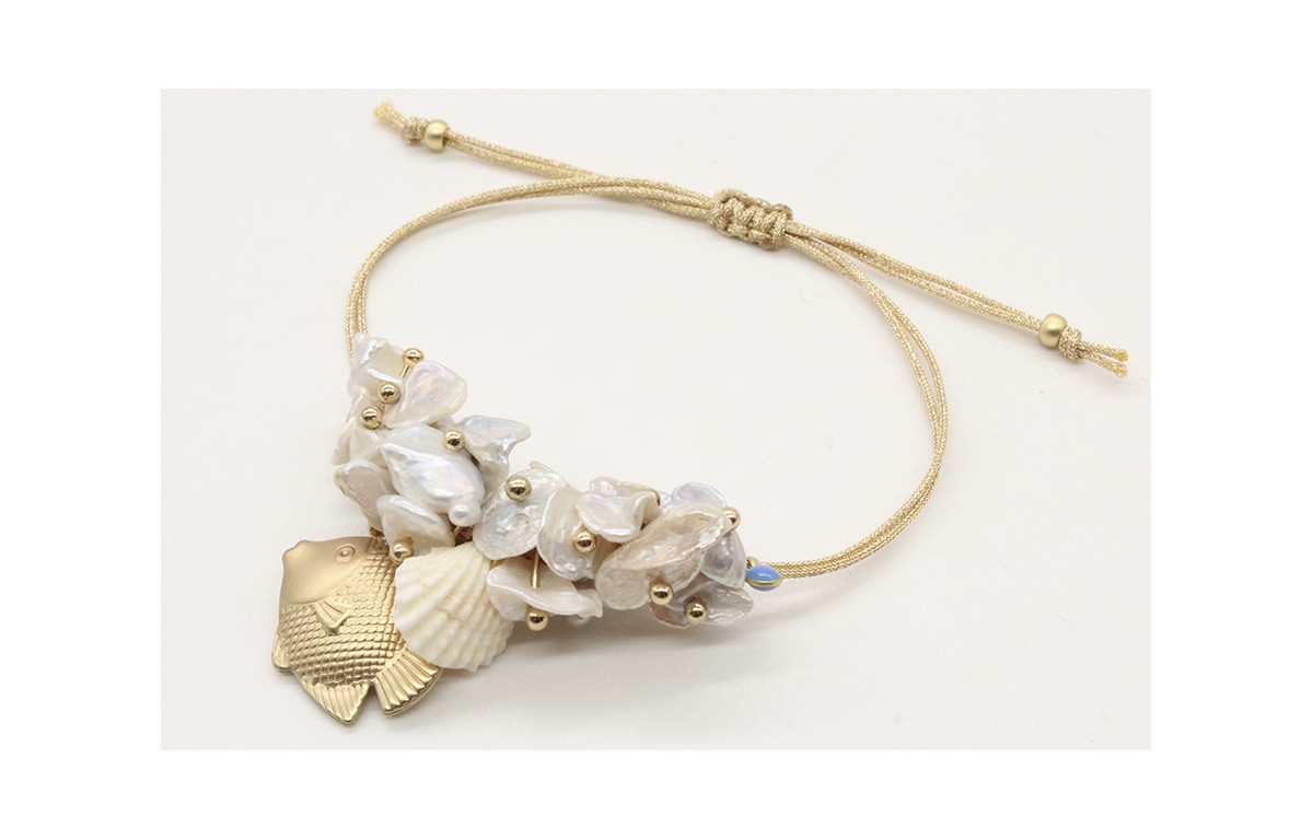 Pulsera cordon macrame oro palido con chips de madre perla, pez oro mate y concha blanca. Es regulable