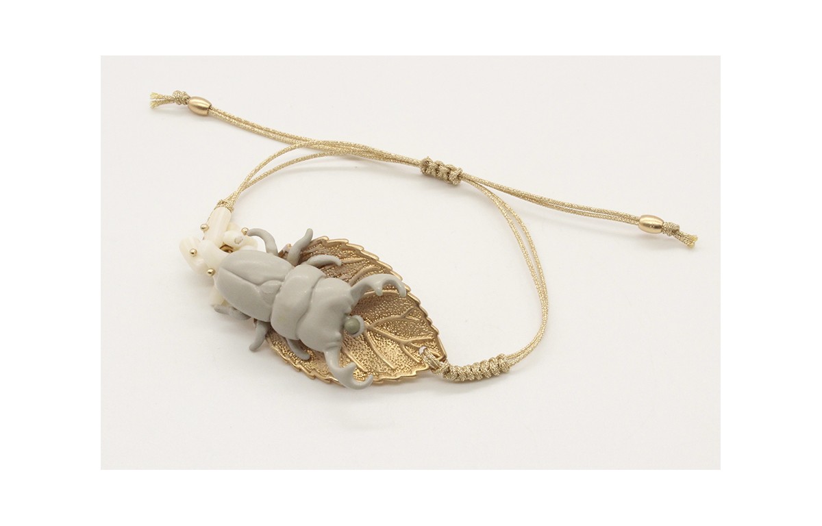 Pulsera hilo macrame oro palido con escarabajo gris, hoja en oro mate y corales blancos. Es regulable.