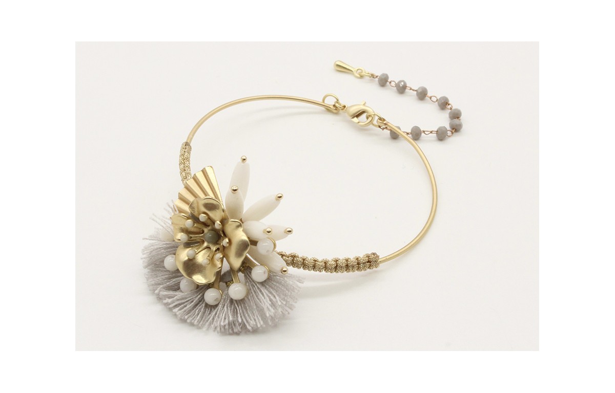 Pulsera hilo macrame oro palido con corales blancos, flor oro mate, pompon gris, casquilla esmaltada gris. Es regulable