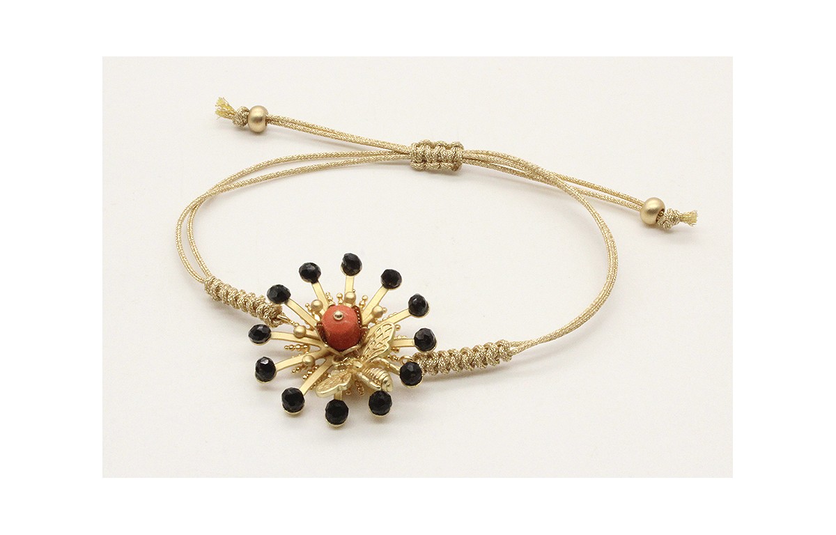Pulsera nudo serpiente oro palido con sol,casquilla con facetadas negras, abeja y tonel coral. Es regulable