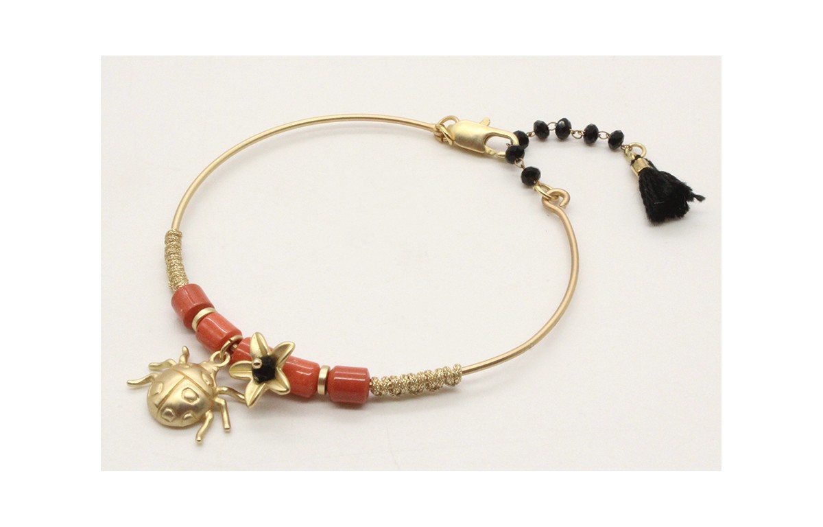 Pulsera rigida con escarabajo pelotero en oro mate, toneles de coral y flor en oro mate, rematada con cadena facetadas negras.