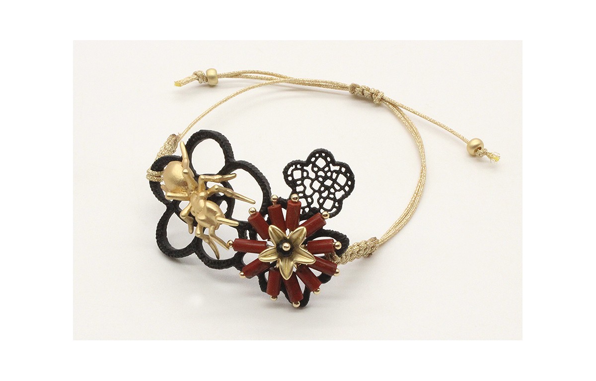 Pulsera macrame oro palido con crochet esmaltado negro, hormiga en oro mate y roseton tubos marrones. Es regulable