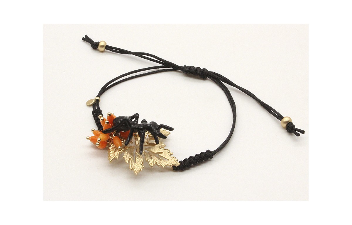 Pulsera nudo serpiente negra con hoja calada oro, hormiga esmaltada negra, ovalitos de coral. Es regulable