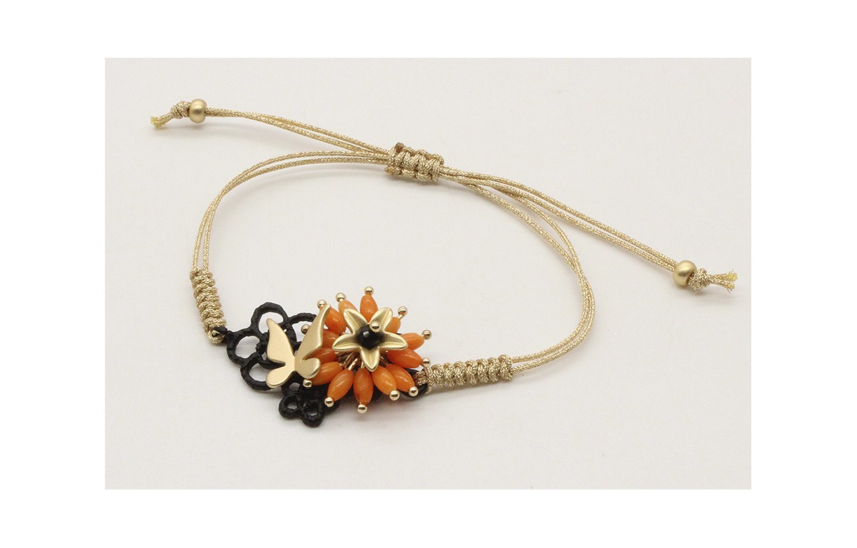Pulsera macrame oro palido con crochet esmaltado negro, mariposa oro mate y roseton ovalitos coral, flor oro mate. Es regulable