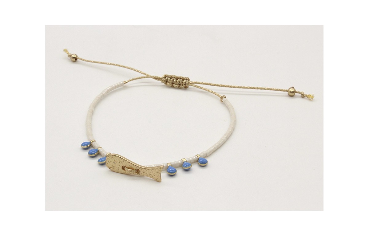 Pulsera hilo macrame oro con miyuki blanco, pez 2 agujeros oro mate, micro-esmalte azul. Es regulable