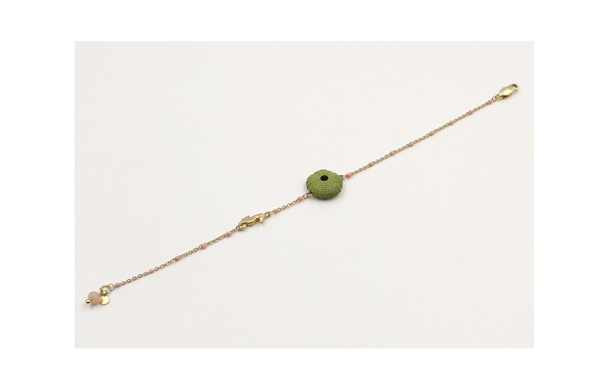 Pulsera cadena bola esmaltada verde con caracol de mar verde y caballito de mar oro mate. Largo 17cm.