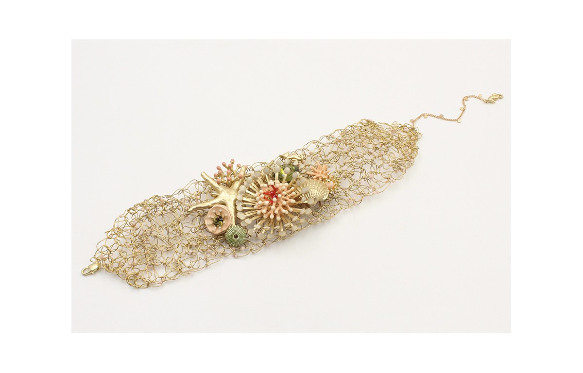 Pulsera de ganchillo con casquillas beige con piezas salmón, estrella oro mate,almeja y brillo oliva. Largo 19cm.