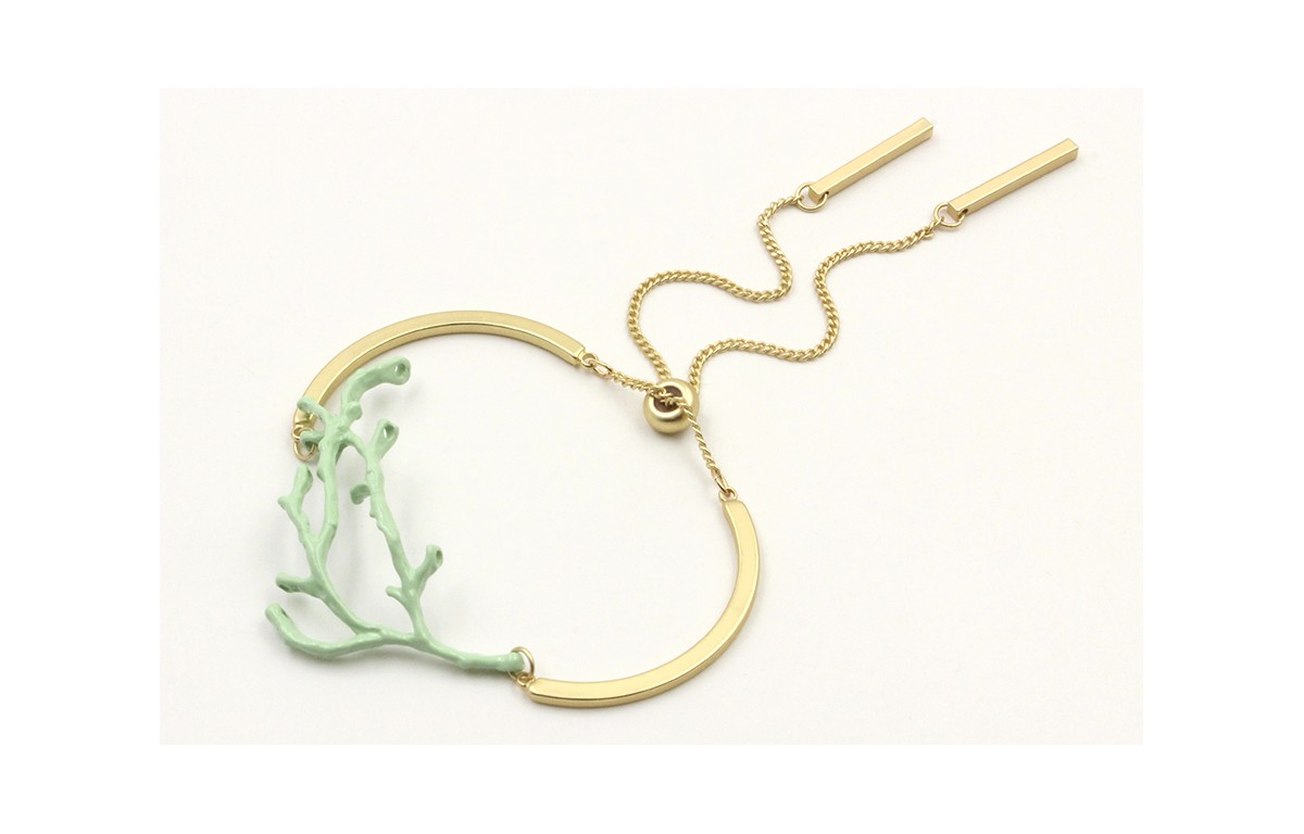 Pulsera semirrigida oro mate con rama de coral turquesa y rematada con cadena y listones. Es regulable
