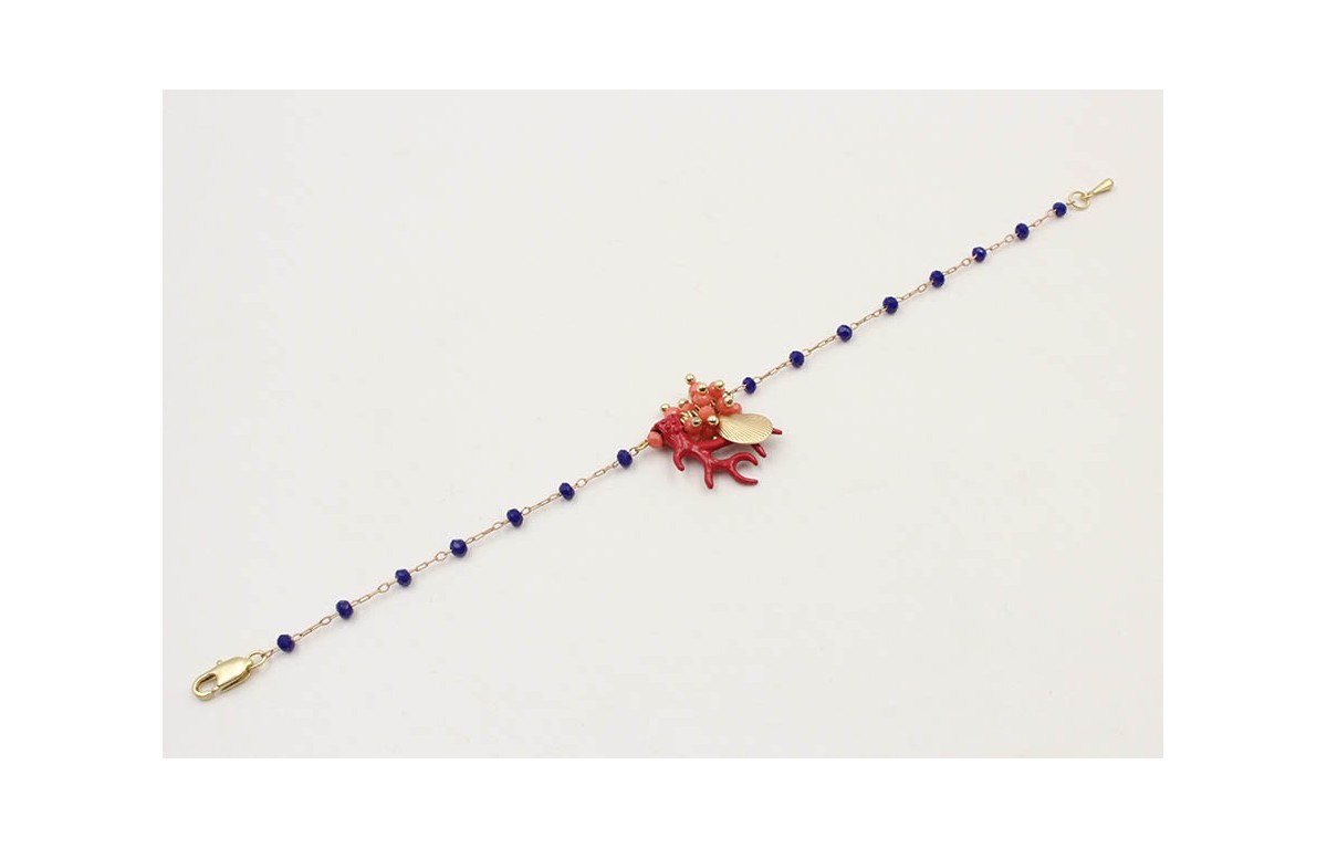 Pulsera cadena facetadas azulonas con burruño facetadas coral colgante rama coral rojo, concha mejillón oro mate. Largo 17cm.
