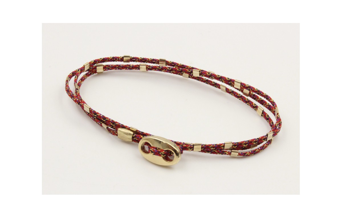 Pulseras micro driza colores rojo vivo y oro con tubiros dorados y cierre calabrote.