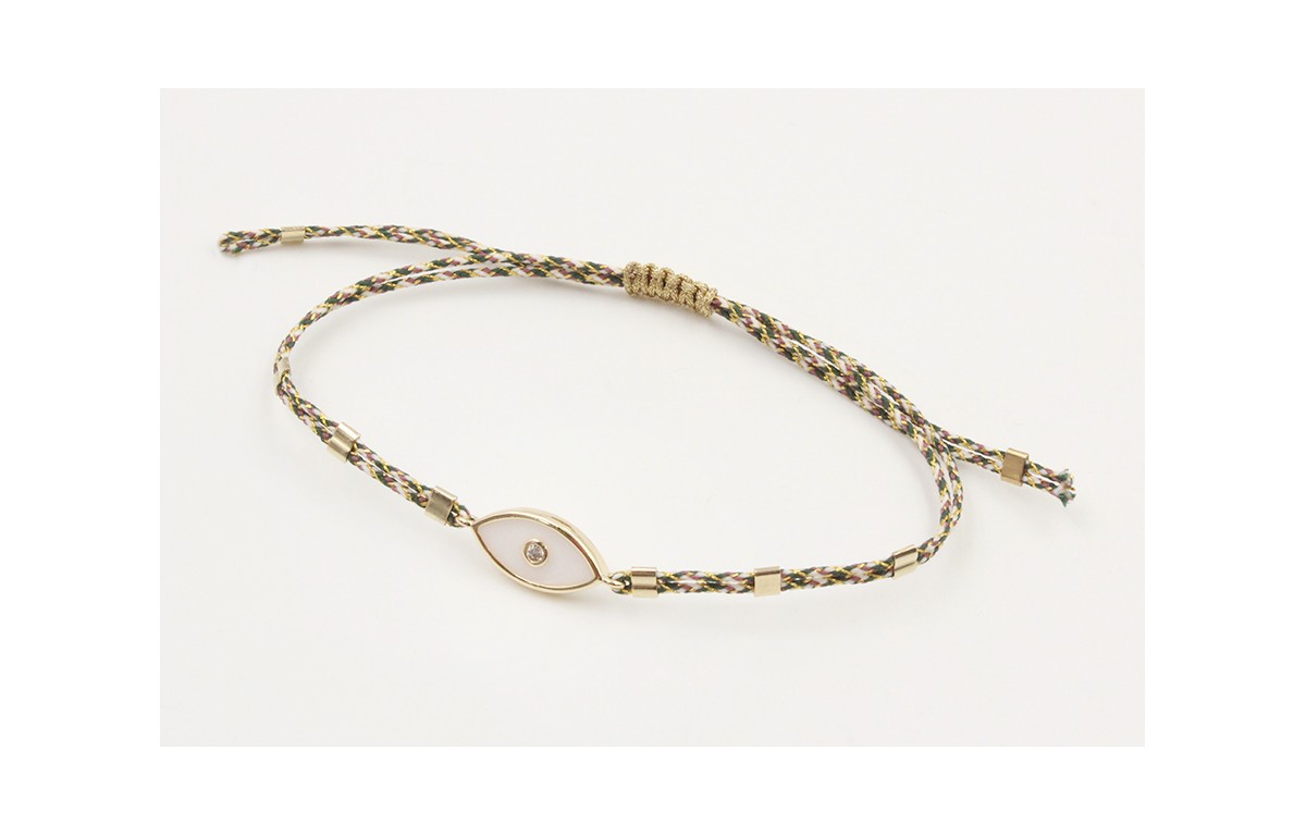 Pulsera macrame marrón, rosa y oro con nudo macrame dorado, ojo turco blanco y tubitos aplastados dorados. Es regulable.