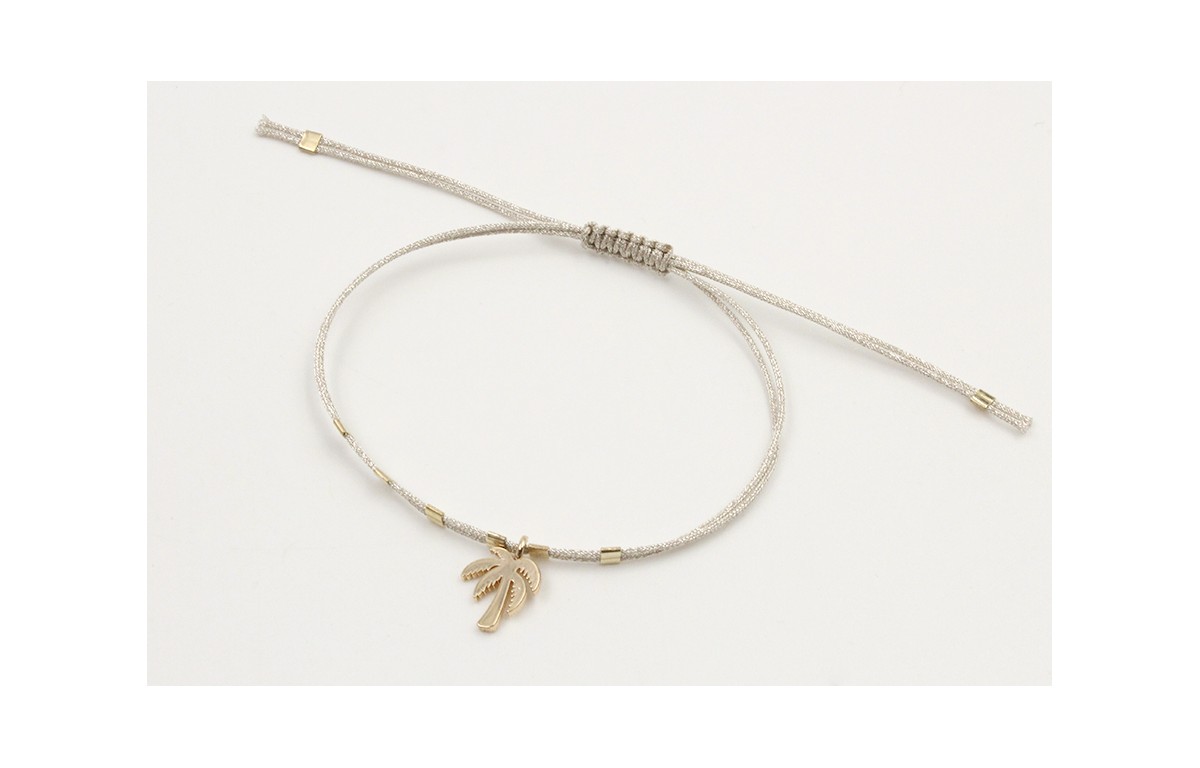 Pulsera hilo microdrusa plateado con colgante palmera acero inoxidable y tubitos dorados. Es regulable.