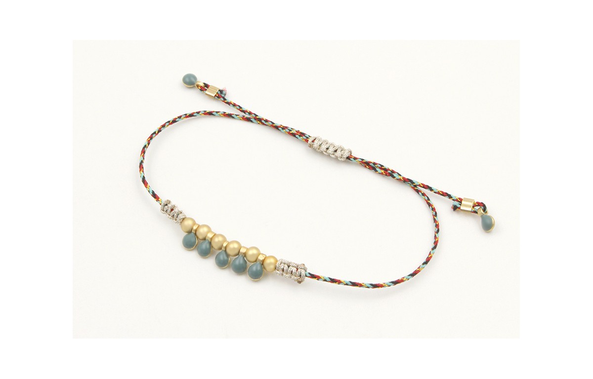 Pulsera hilo macrame azul,rojo y oro con nudo macrame plateado con colgantes esmaltitos azul petroleo y bolitas. Es regulable