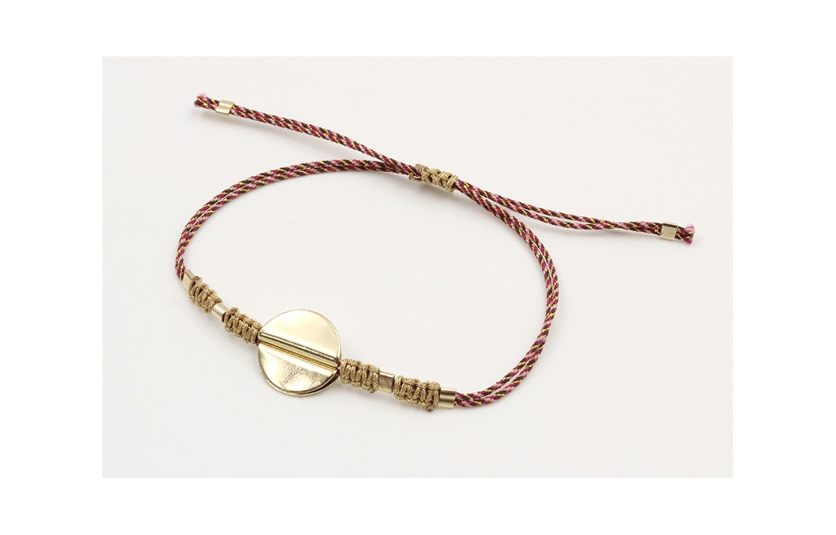 Pulsera hilo microdriza granate y oro con nudo macrame dorado y centro piezas doradas. Es regulable.